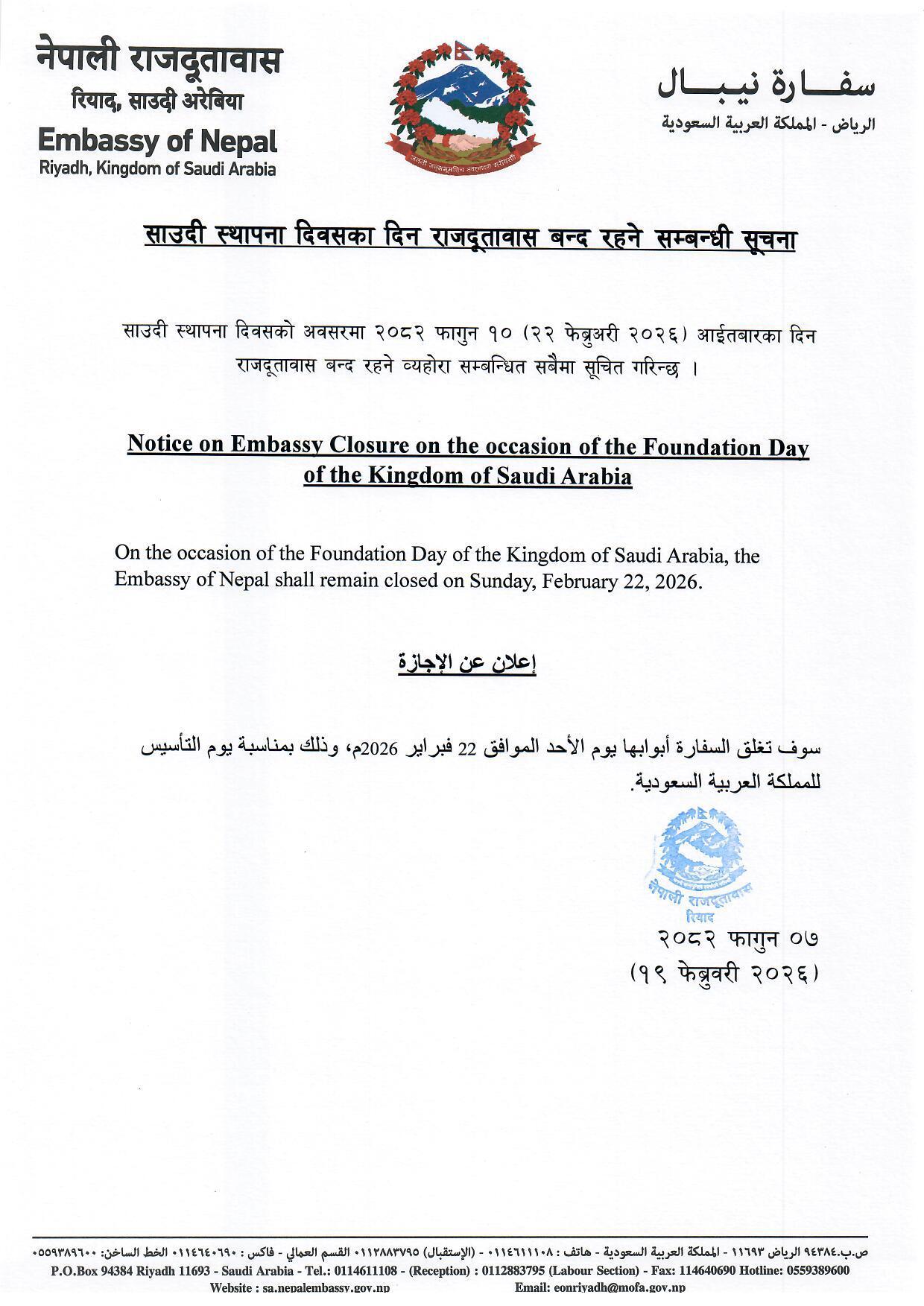 Notice on Embassy closure on the occasion of the Foundation Day of the Kingdom of Saudi Arabia