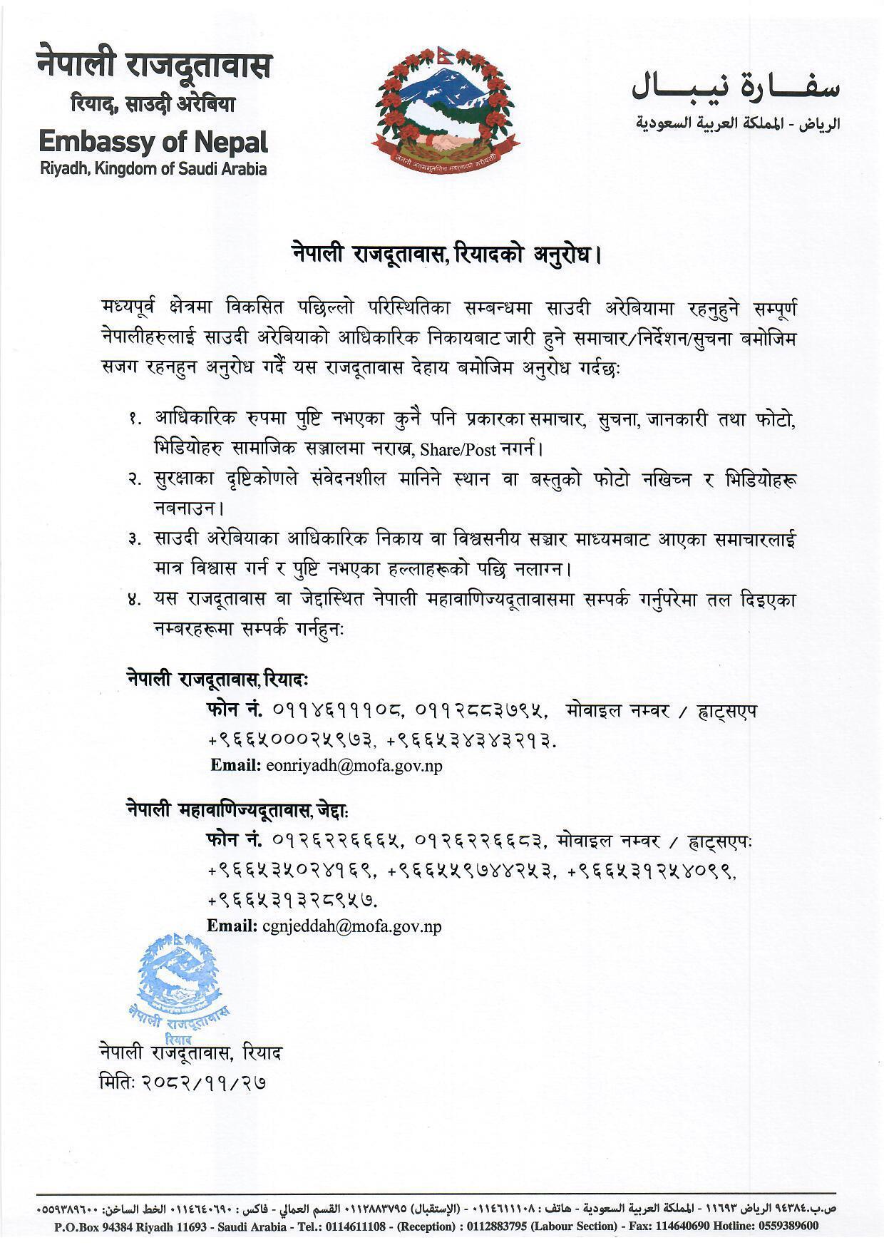 नेपाली राजदूतावास, रियादको अनुरोध ।
